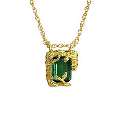 Tourmaline Chamber Amulet available online and in store at Tomfoolery London. A beautifully crafted yellow gold and emerald pendant that moves freely along the chain, with delicate carved-like detail. This piece emulates the symbolism of treasure. It is a tribute to the human desire for quest and seeking. The vibrant green gemstone is encased in a rectangular chamber veiled in laurel branches."
